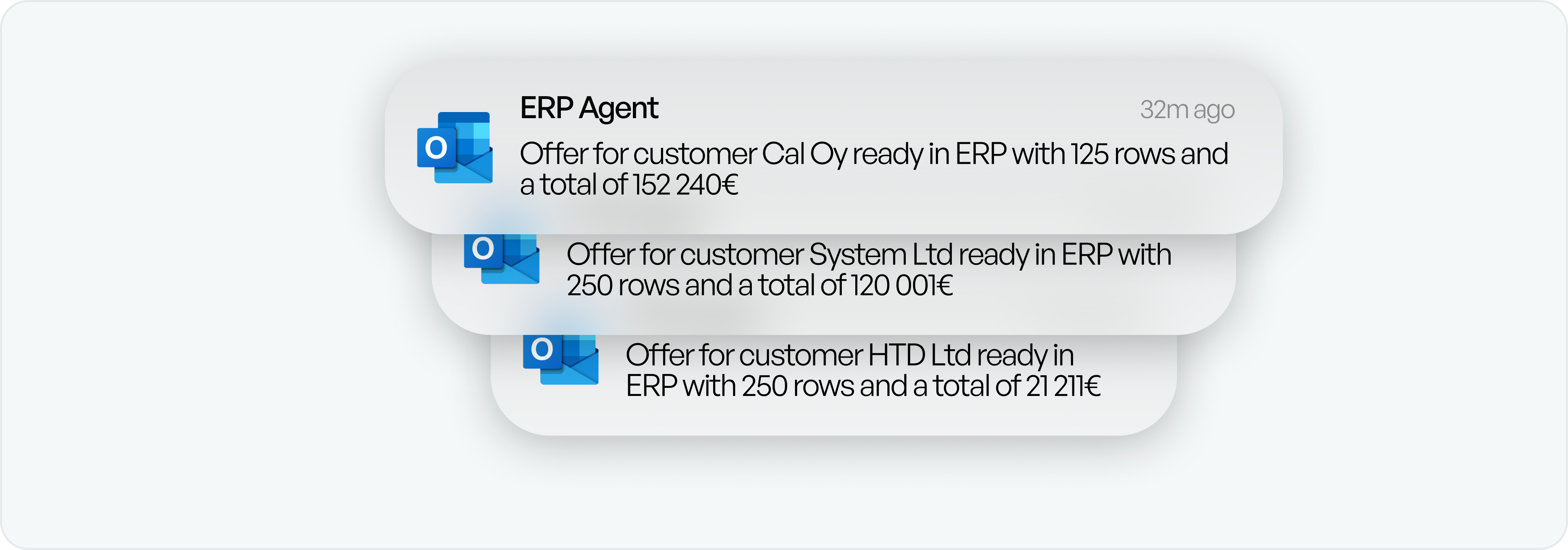 Genererar kundklara offerter från förfrågningar, e-post eller CRM-anteckningar. Tillämpar prisregler, rabatter och tillgänglighetskontroller från ERP-data.