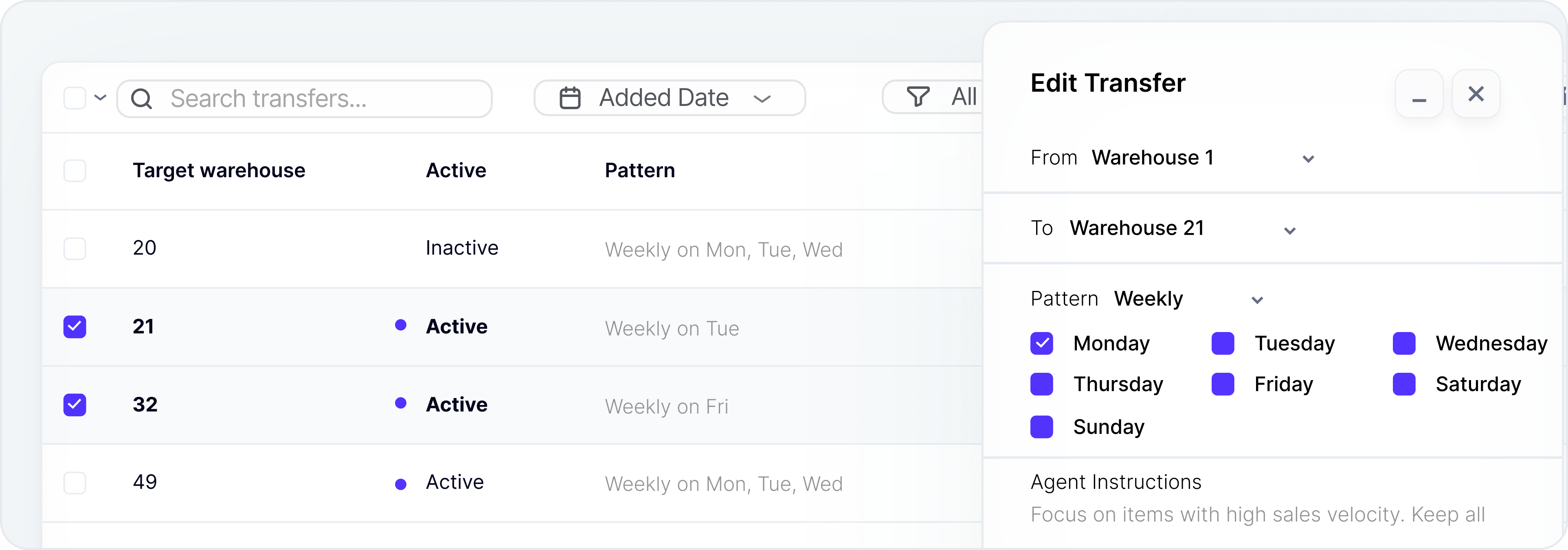 Utför dagliga lagerförflyttningar mellan platser baserat på efterfrågemönster, lagernivåer och affärsregler med fullständiga granskningsloggar.